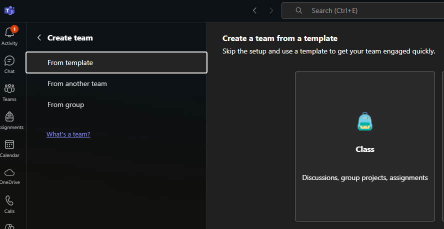 You should first set up an MS Teams group for your students. I prefer to set up a “Class” group, as it has some additional functionality that can prove useful for a class (such as having a shared ClassNotebook).